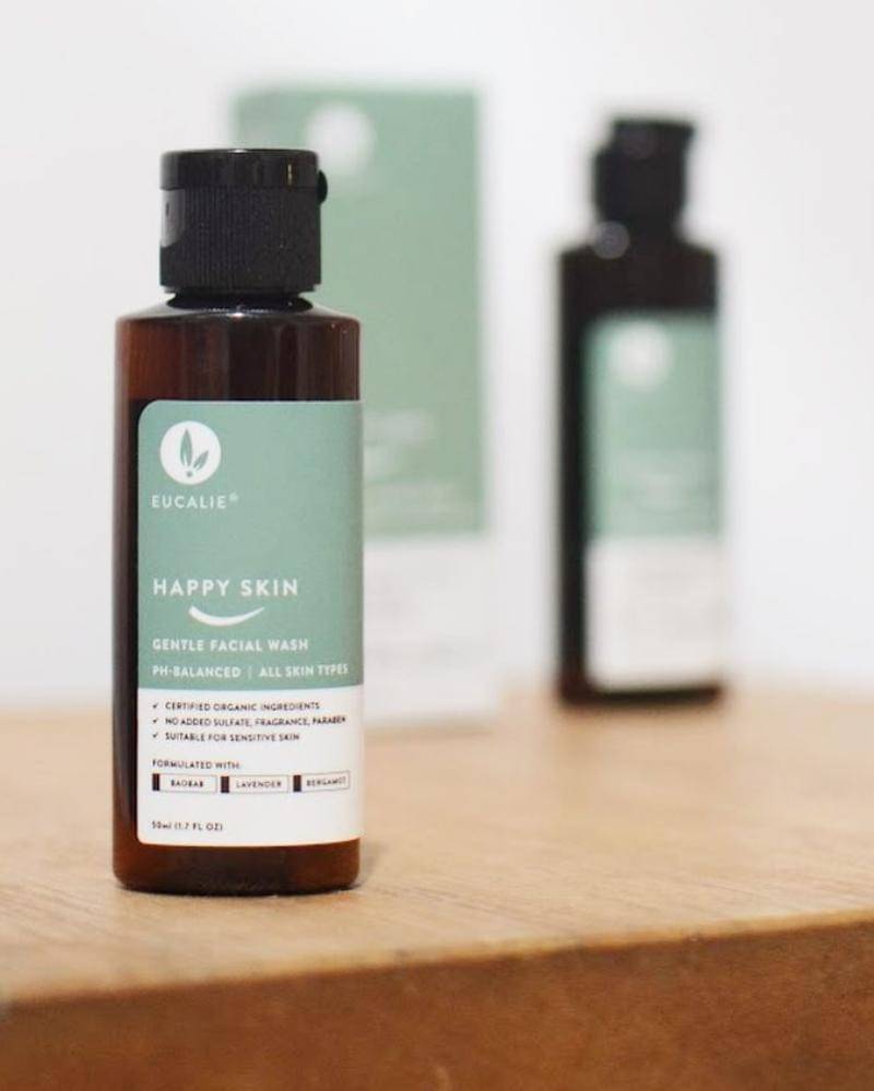 - Eucalie Organic Gentle Facial Wash, pembersih wajah dengan peptida baobab dan lavender, mencegah jerawat, harga Rp 166.000