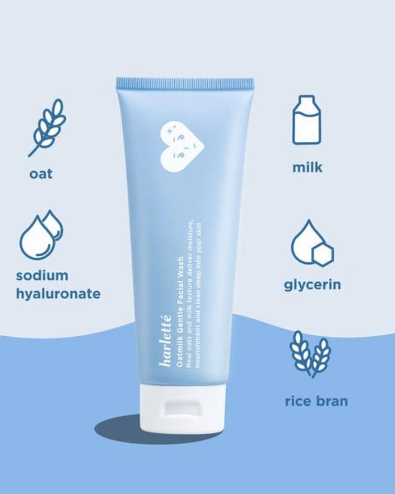 - Harlette Oatmilk Gentle Facial Wash, mengandung oat dan rice bran untuk menjaga kelembapan kulit, harga Rp 50.000