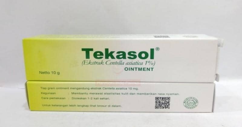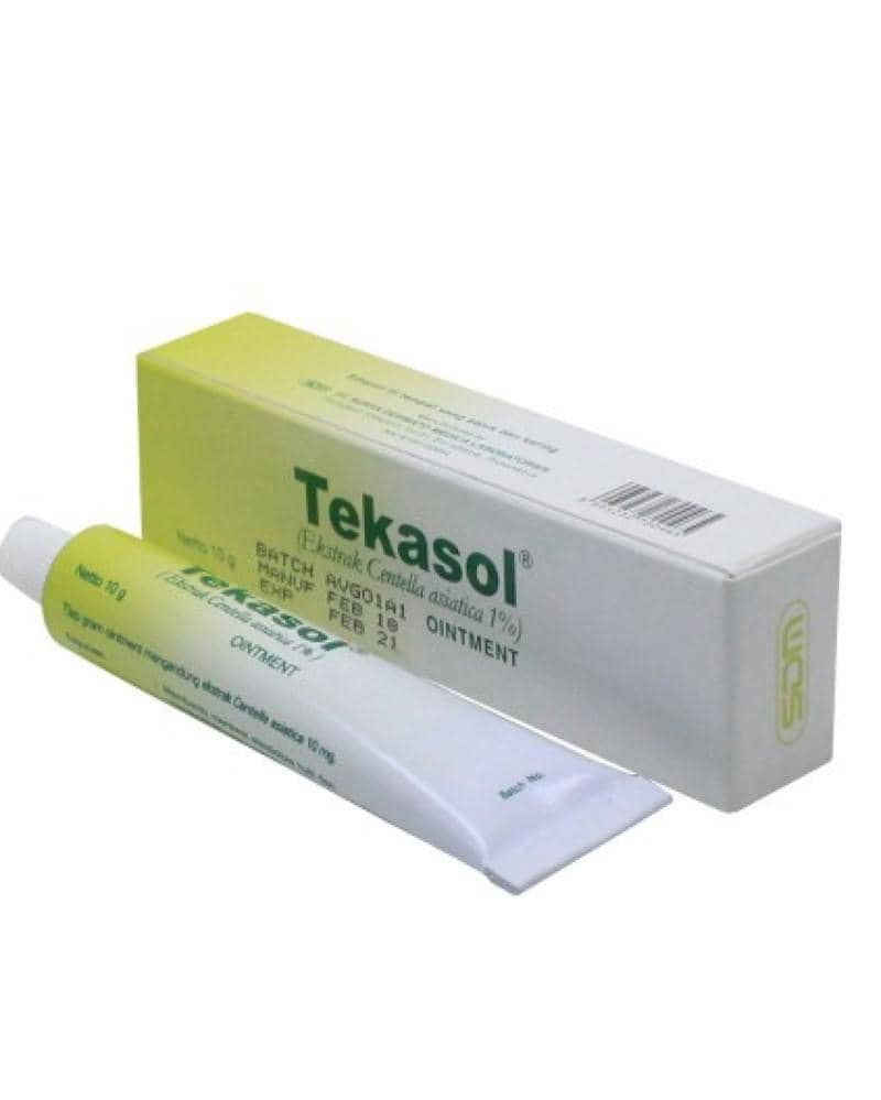 - Kandungan aktif dalam Tekasol Oint 1% adalah ekstrak centella asiatica yang memiliki manfaat seperti mengurangi peradangan, menjaga kelembapan kulit, dan mencegah keloid.