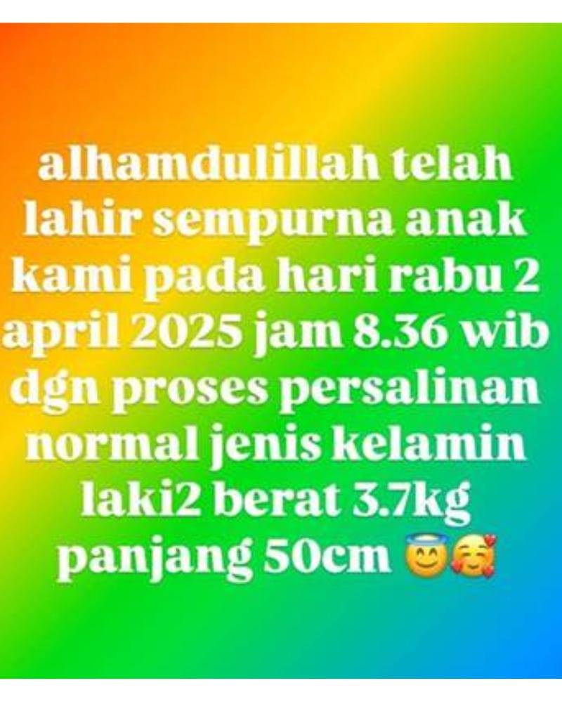 Ia menuliskan update di IG Story berupa, "Alhamdulillah telah lahir sempurna anak kami pada hari Rabu, 2 April 2025, jam 8.36 WIB dengan proses persalinan normal. Jenis kelamin laki-laki, berat 3,7 kg, panjang 50 cm."