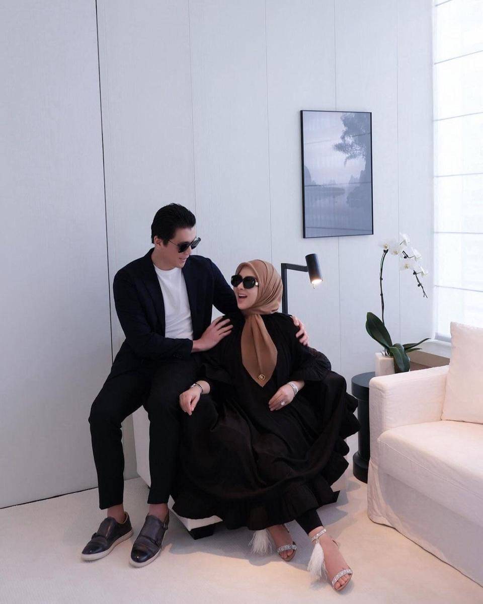 Perempuan yang dahulu terkenal dengan penampilan nyentriknya ini tampak berpose duduk anggun di sofa, ditemani sang suami. Keduanya tampil kompak dan serasi mengenakan busana bernuansa hitam.