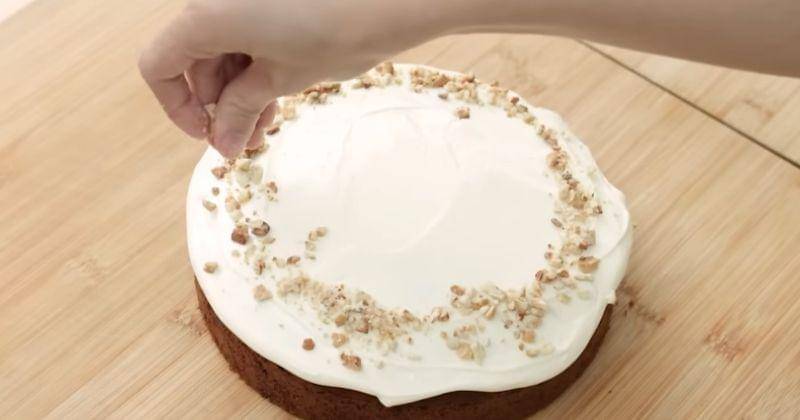 - Semprotkan topping cream cheese di atas cake, ratakan kemudian tuang kacang mete cincang dan kurma di atasnya.