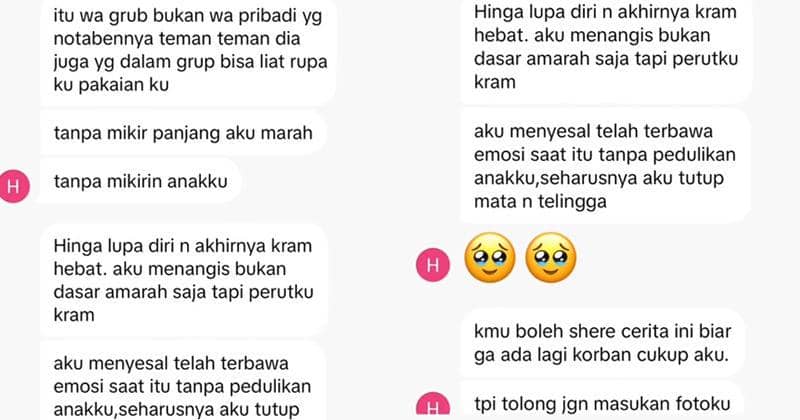 "Tanpa mikir panjang aku marah. Tanpa mikir anakku. Hingga lupa diri dan akhirnya kram hebat, aku menangis bukan dasar amarah saja tapi perutku kram. Aku menyesal terbawa emosi saat itu tanpa pedulikan anakku, seharusnya aku tutup mata dan telinga," cerita korban.