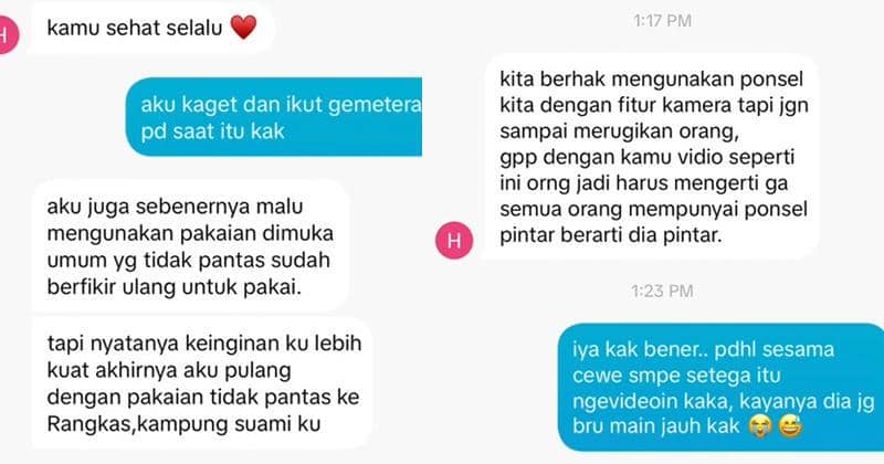 "Aku juga sebenarnya malu menggunakan pakaian di muka umum yang tidak pantas, sudah berpikir ulang untuk pakai. Tapi nyatanya keinginanku lebih kuat akhirnya aku pulang dengan pakaian tidak pantas ke Rangkas, kampung suamiku," pungkasnya.