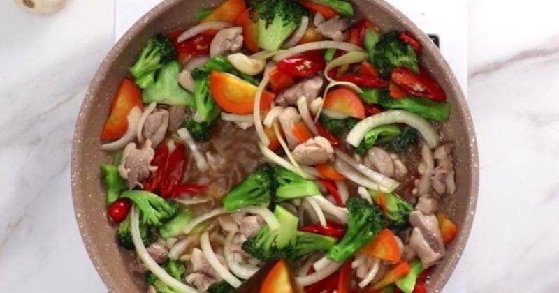 - Masukkan ayam, dan tumis kembali bersama brokoli hingga matang