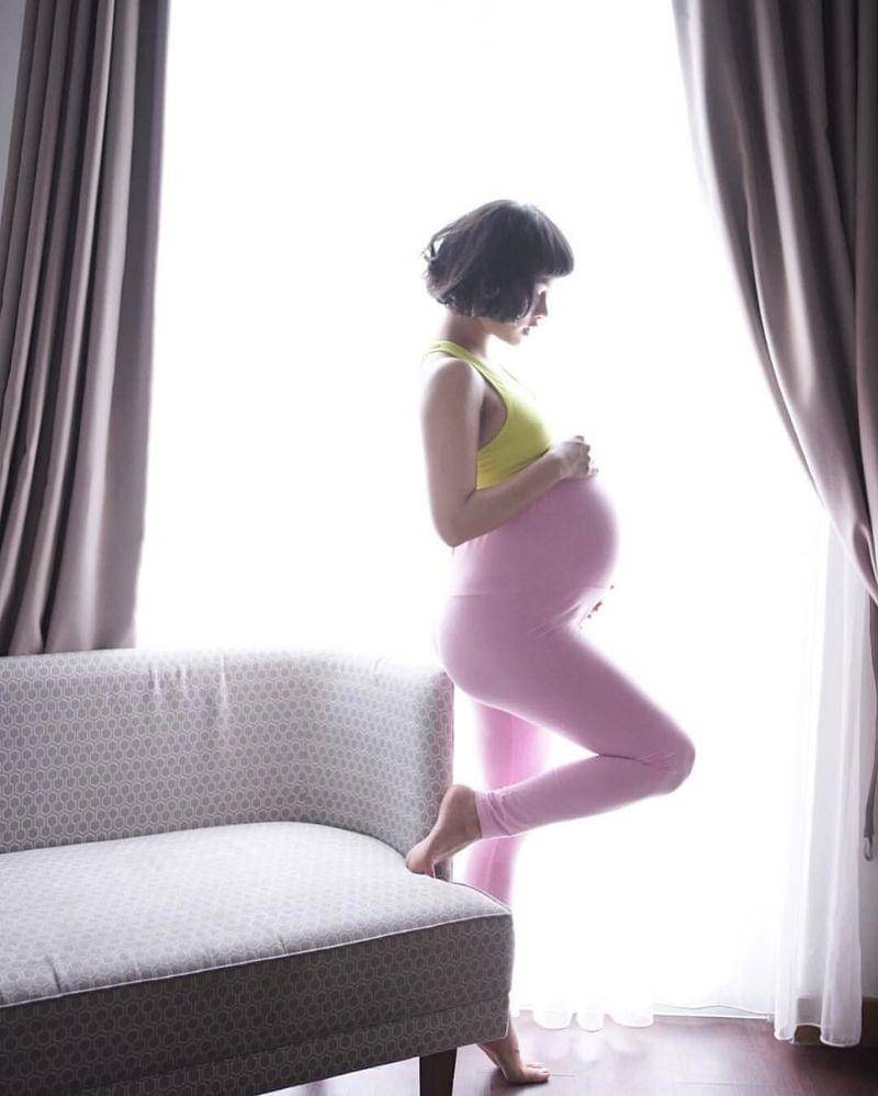 Andien membungkus baby bump-nya dengan celana legging berwarna pink. Ia memadukannya dengan sport bra berwarna kuning sehingga tak hanya menghasilkan kesan sporty, tetapi juga cheerful dan fresh.