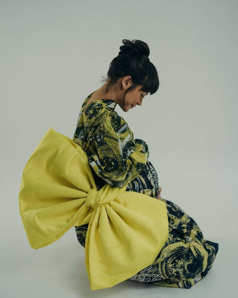 Kali ini, Andien tampil unik dengan busana berwarna kuning dan hitam bermotif artistik. Penampilannya semakin mencuri perhatian dengan aksen pita besar berwarna kuning cerah di bagian belakang yang memberikan kesan playful.