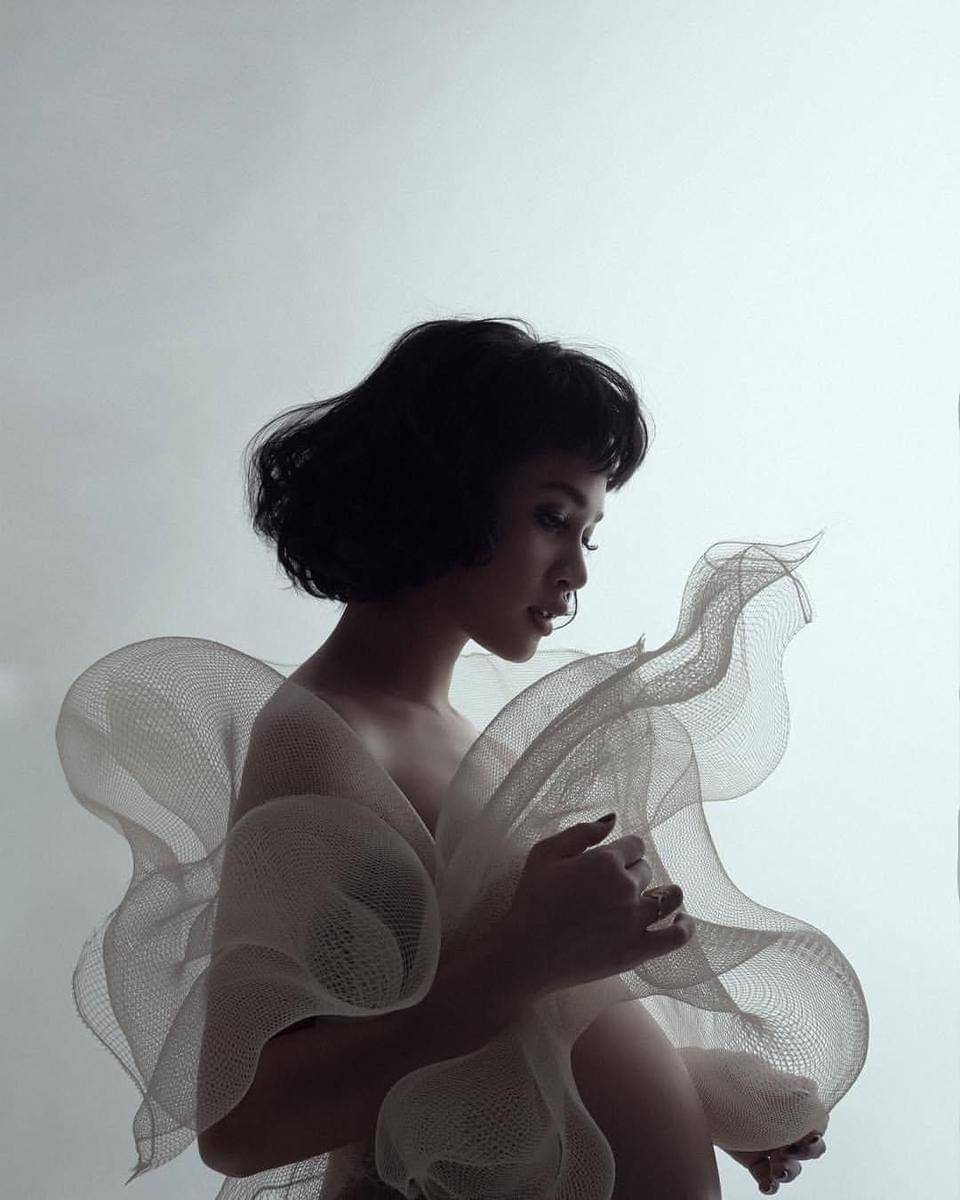 Andien tampil semi naked dengan kain tembus pandang yang mengelilinginya. Baby bump-nya menjadi highlight dari foto ini karena sudah terlihat cukup besar.