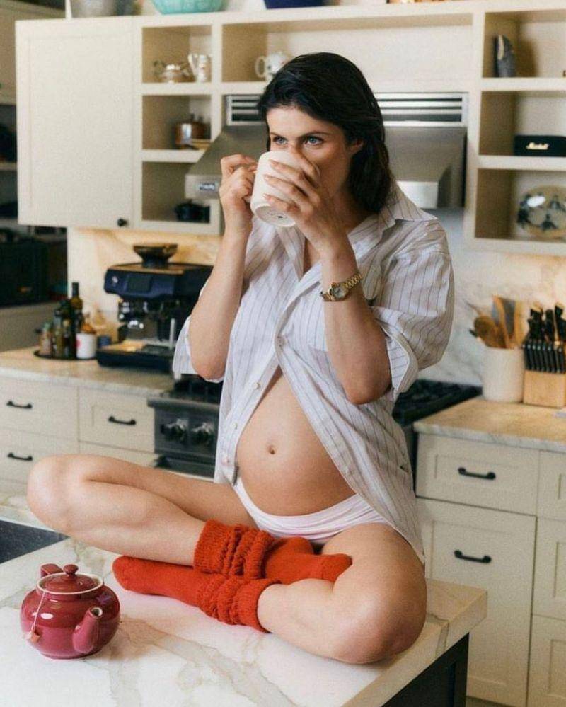 Dalam unggahan tersebut, Alexandra Daddario memamerkan baby bump-nya dengan berpose minum sambil duduk. Di usia kandungannya sudah menginjak enam bulan, baby bump-nya sudah terlihat membesar dalam balutan kemeja dengan kancing setengah terbuka.