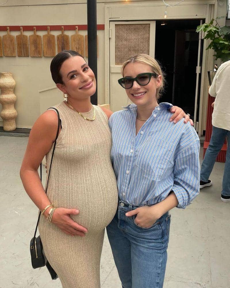 Terbaru, Lea Michele memamerkan baby bump-nya di Instagram saat menikmati musim panas di Hamptons dengan lawan mainnya di serial 'Scream Queens', Emma Roberts. Dalam potret tersebut, Lea Michele terlihat memamerkan baby bump-nya dalam balutan fitted beige dress, yang dipadukan dengan perhiasan gold dan tas hitam.