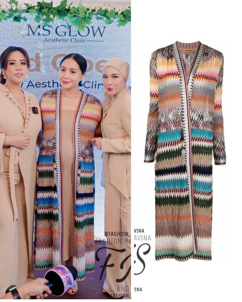 Selanjutnya Nagita Slavina tampil dengan bodycon dress dari asos.com yang dipadukan dengan cardigan panjang dengan motif pola zig zag dari farfetch.com. Dengan paduan outfit ini, Nagita Slavina tampak menawan dan elegan ya, Ma.