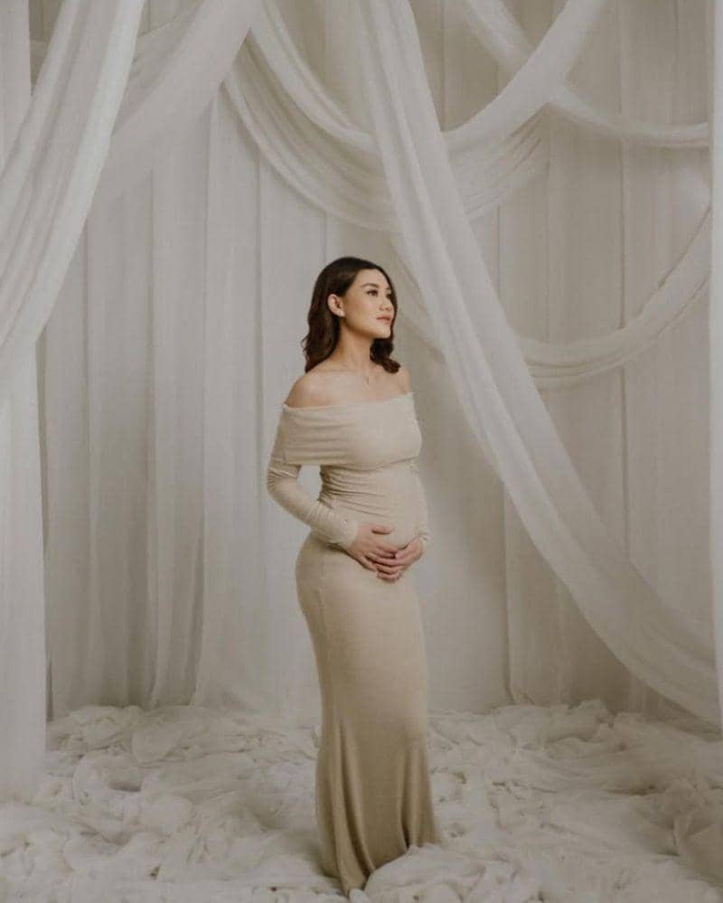 Pada potret pertama, Aaliyah tampil sangat anggun mengenakan dress off-shoulder berwarna cream yang semakin memperlihatkan baby bump-nya.