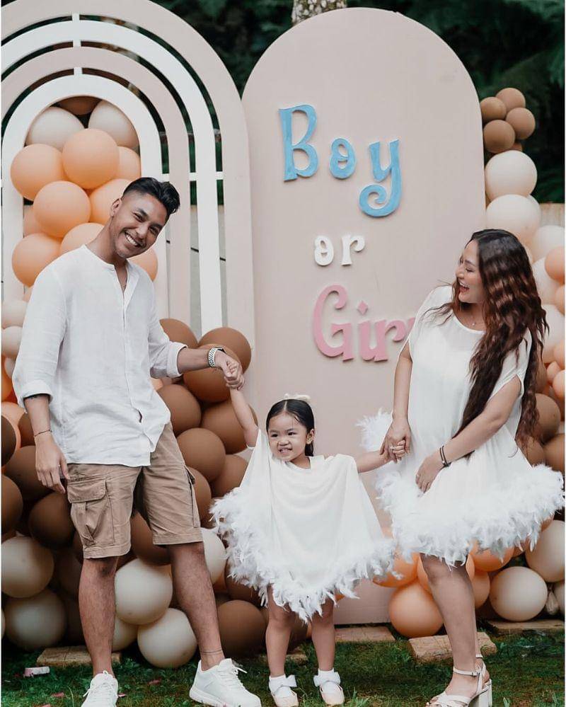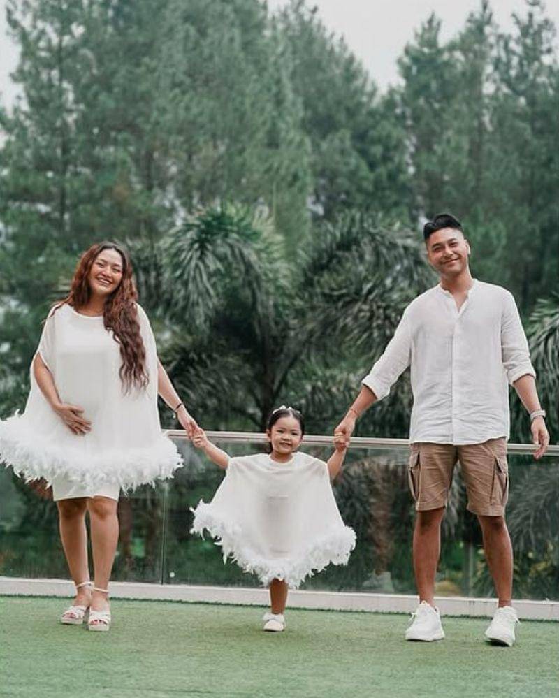 Seperti yang terlihat, keluarga kecil ini tampak kompak mengenakan baju berwarna putih. Kebahagiaan pun terpancar dari ketiganya yang sebentar lagi akan menyambut anggota keluarga baru.