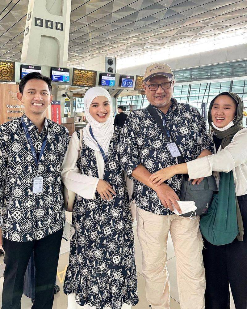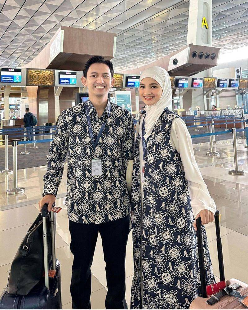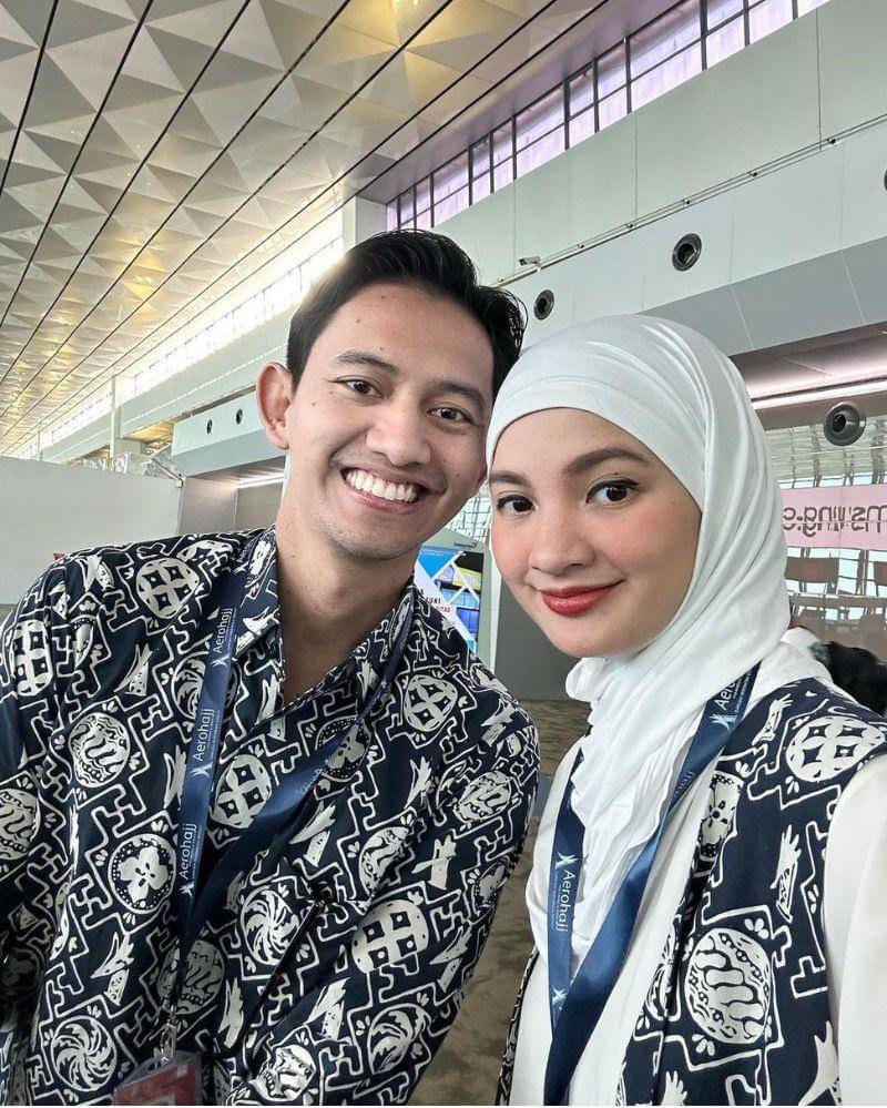 Ini dia foto selfie Sabrina dan Belva Devara yang tampak begitu sumringah. Keduanya tampil kompak mengenakan seragam dari biro perjalanan umrah.