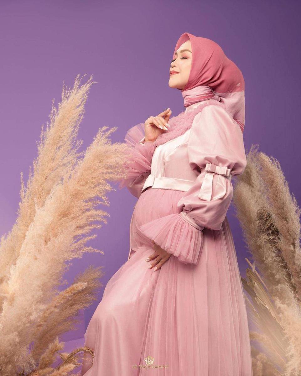 1. Ria Ricis tampil dalam balutan busana serba pink dalam foto maternity