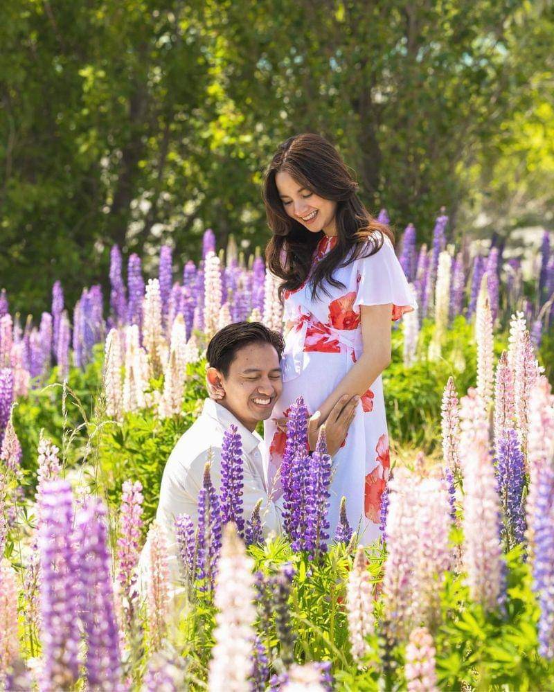 Saat babymoon di Danau Tekapo, Sabrina sendiri tampil menawan dengan dress putih bermotif bunga. Anggun sekali, ya, bumil yang satu ini!