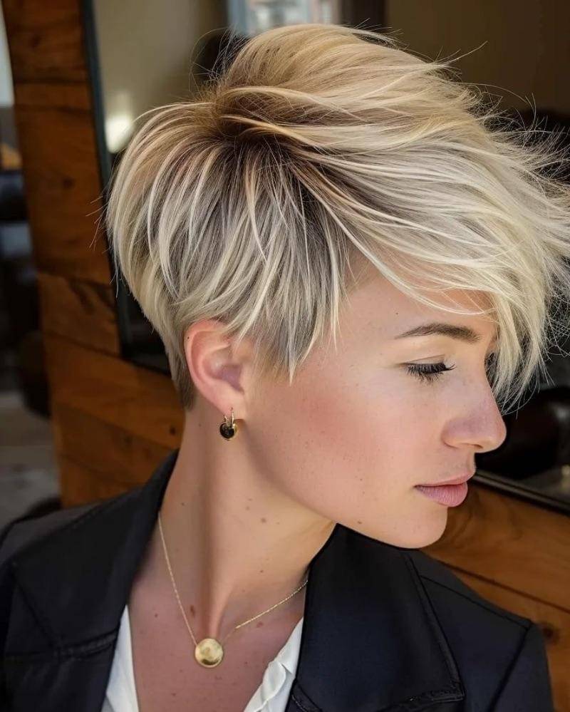 Meskipun pendek, pixie cut tetap memberikan kesan yang tegas dan modern. Untuk menambah gaya, Mama bisa menata rambut dengan sedikit wax atau gel agar terlihat lebih edgy.