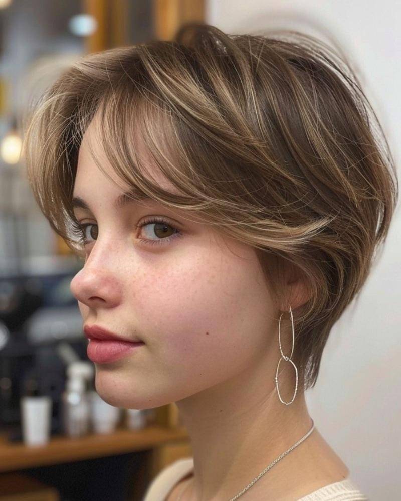 Potongan pixie bertekstur memberikan tampilan rambut pendek yang modern dan stylish. Tekstur tambahan membuat rambut tampak lebih bervolume, menciptakan kesan dinamis yang cocok untuk Mama yang ingin tampil simpel namun tetap menarik.