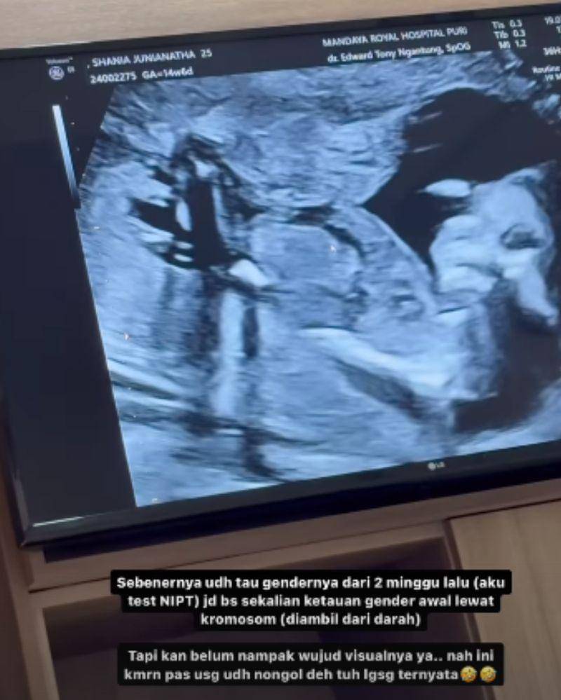 "Sebenernya udah tau gendernya dari 2 minggu lalu (aku test NIPT) jadi bisa sekalian ketahuan gender awal lewat kromosom (diambil dari darah). Tapi kan belum nampak wujud visualnya ya. Nah, ini kemarin pas USG udah nongol deh tuh langsung ternyata," jelas Shanju.