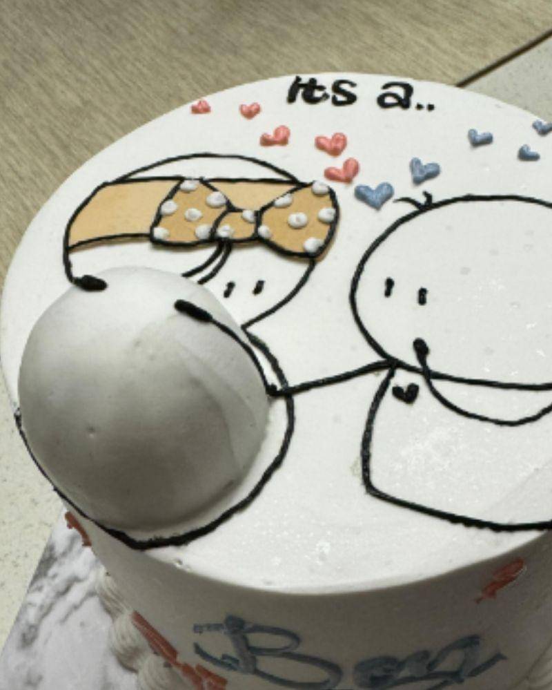 Kue tersebut dihias dengan gambar pasangan suami istri dengan perut yang menonjol. Pada kue tersebut juga tertulis kalimat "It's A..." dengan hiasan berbentuk hati berwarna biru dan juga merah muda.