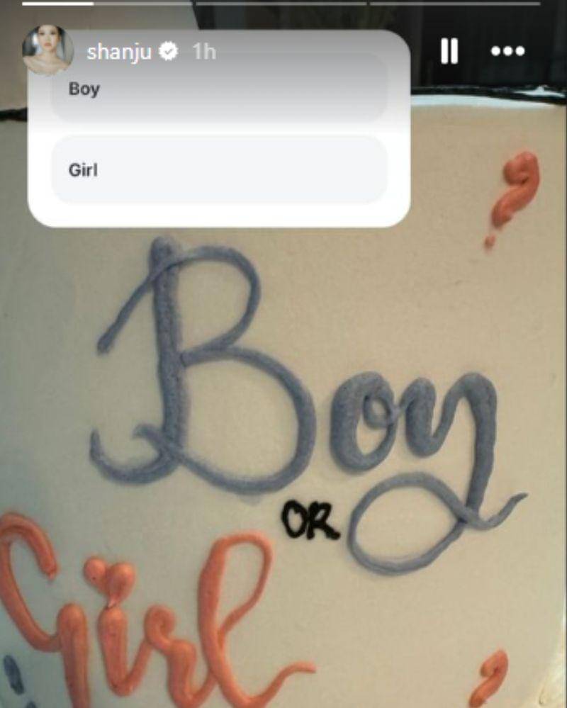 Unggahan yang dibagikan Shanju menampilkan sebuah kue bertuliskan Boy & Girl. Ia juga menyematkan fitur polling yang membantu netizen untuk memilih jenis kelamin buah hatinya itu.