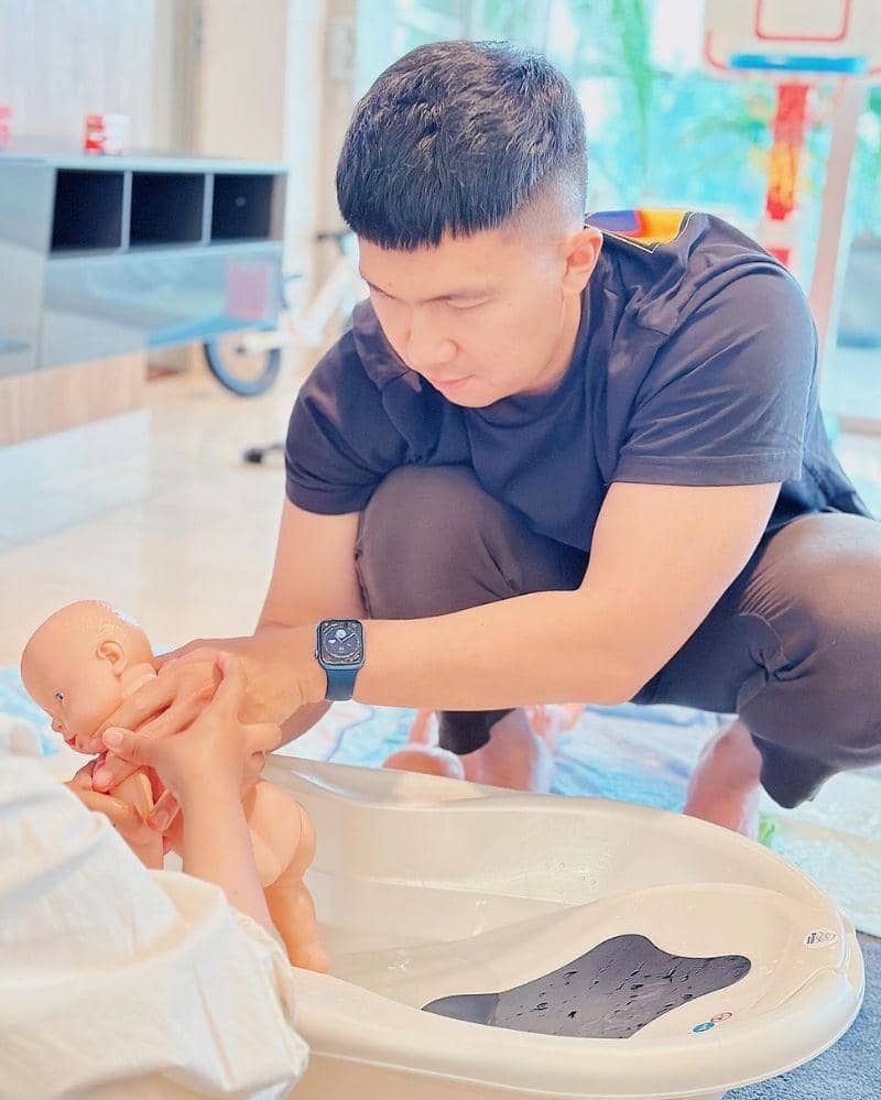 Bahkan, Indra Priawan turut belajar seputar perawatan bayi dan langsung mempraktikkannya lewat boneka. Seperti pada potret yang satu ini, Indra tampak begitu serius saat belajar memandikan bayi sesuai dengan arahan sang bidan.