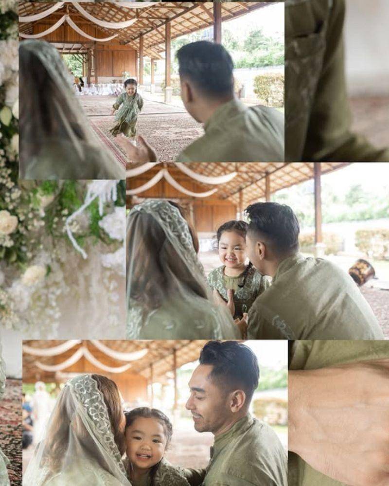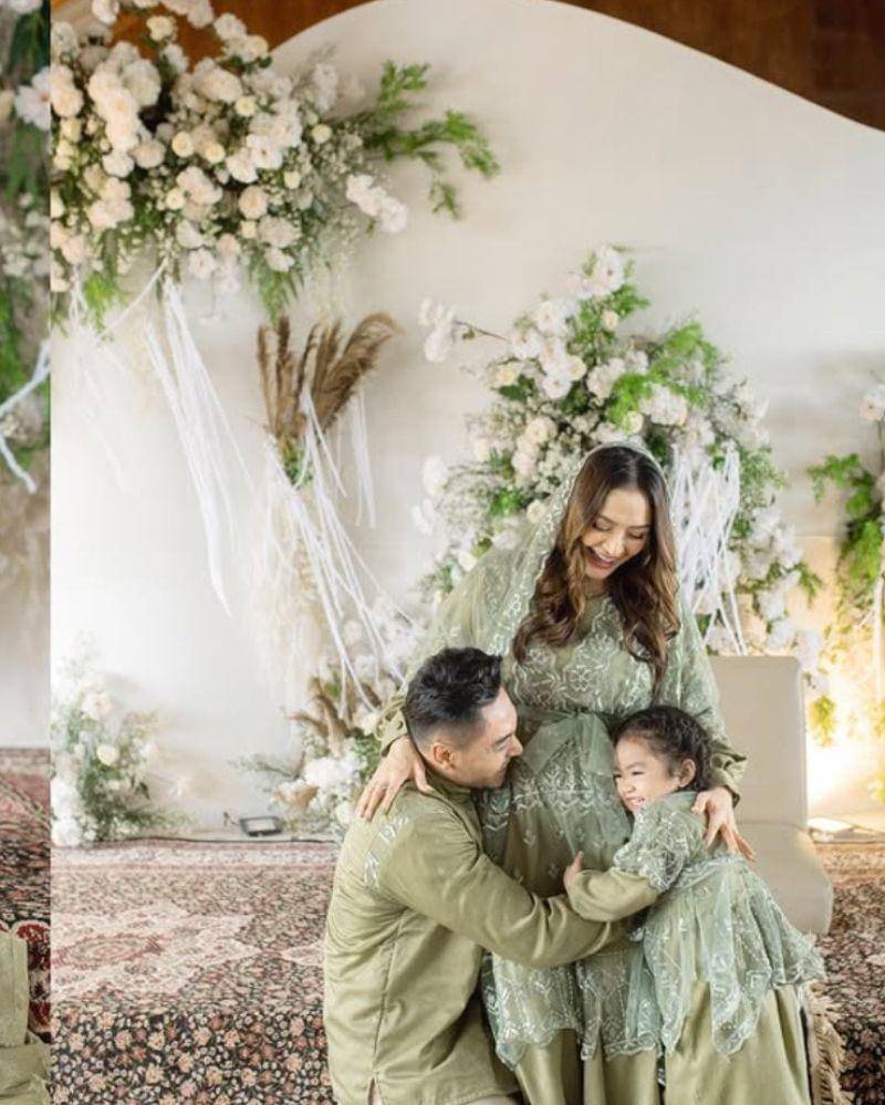 Siti Badriah, Krisjiana, dan anak pertama mereka, Xarena, tampil serasi dalam busana bernuansa hijau. Kehangatan keluarga kecil ini terlihat begitu jelas saat mereka menikmati acara bersama-sama.
