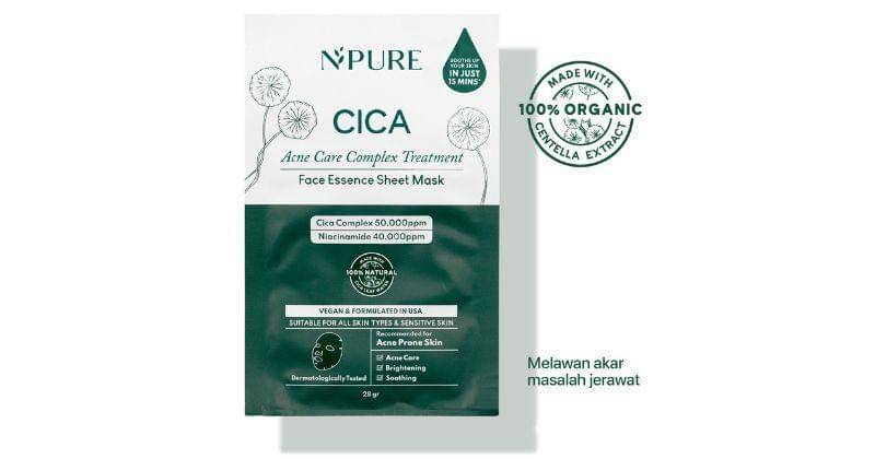 Beralih ke rekomendasi skincare untuk atasi jerawat yang aman untuk hamil selanjutnya, kali ini ada NPURE Cica Face Sheet Mask. Sheet mask ini memiliki tiga manfaat sekaligus, yakni acne care, brightening, dan soothing.