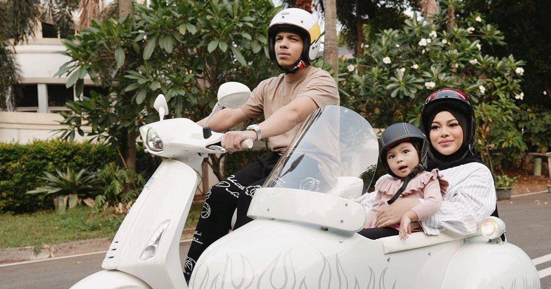 Tak hanya berdua, ada pula Ameena yang tampak duduk dengan anteng di pangkuan sang Mama. Mereka berkeliling di daerah sekitar rumah menaiki motor sembari mengenakan helmet.
