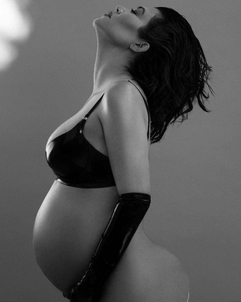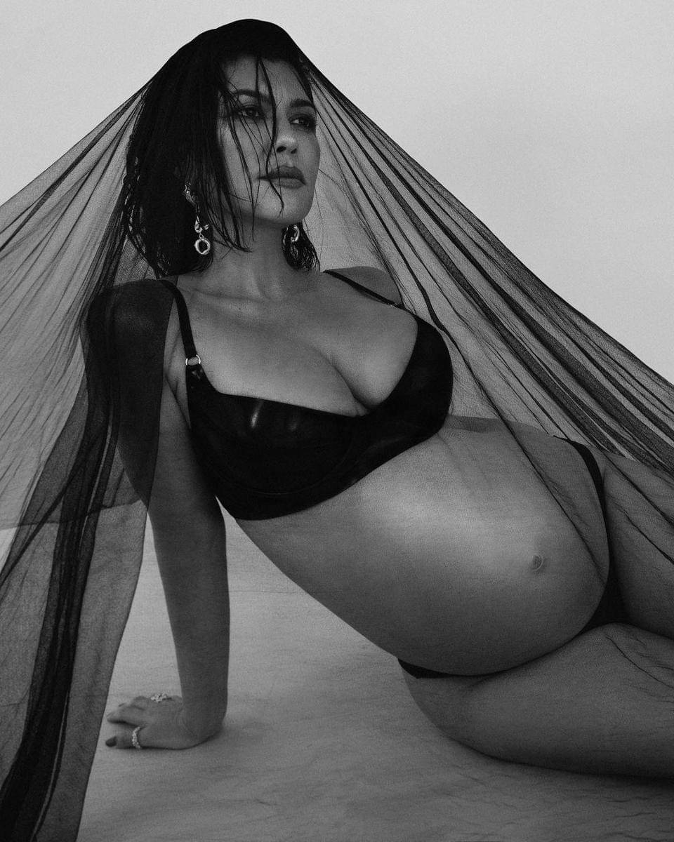Dalam maternity shoot bernuansa black and white ini, Kourtney tampil dengan set leather bra dan underwear berwarna hitam. Perut hamilnya yang sudah terlihat besar tampak begitu mencuri perhatian di bawah veil berwarna hitam.