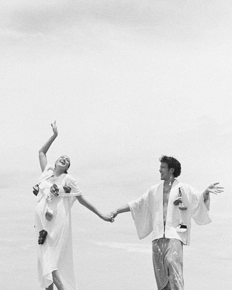 Sementara itu, Dimas Anggara memakai atasan outer kimono yang dibeli saat keduanya honeymoon di Jepang. Selain itu, kain yang menjadi bawahan outfit Dimas merupakan kain lilit hasil karya mereka dari nadi.sarna.