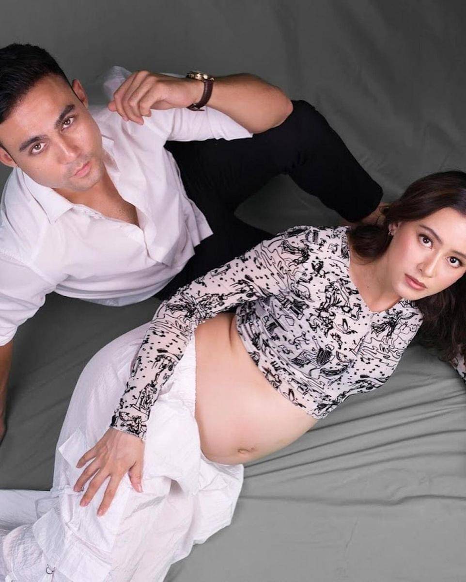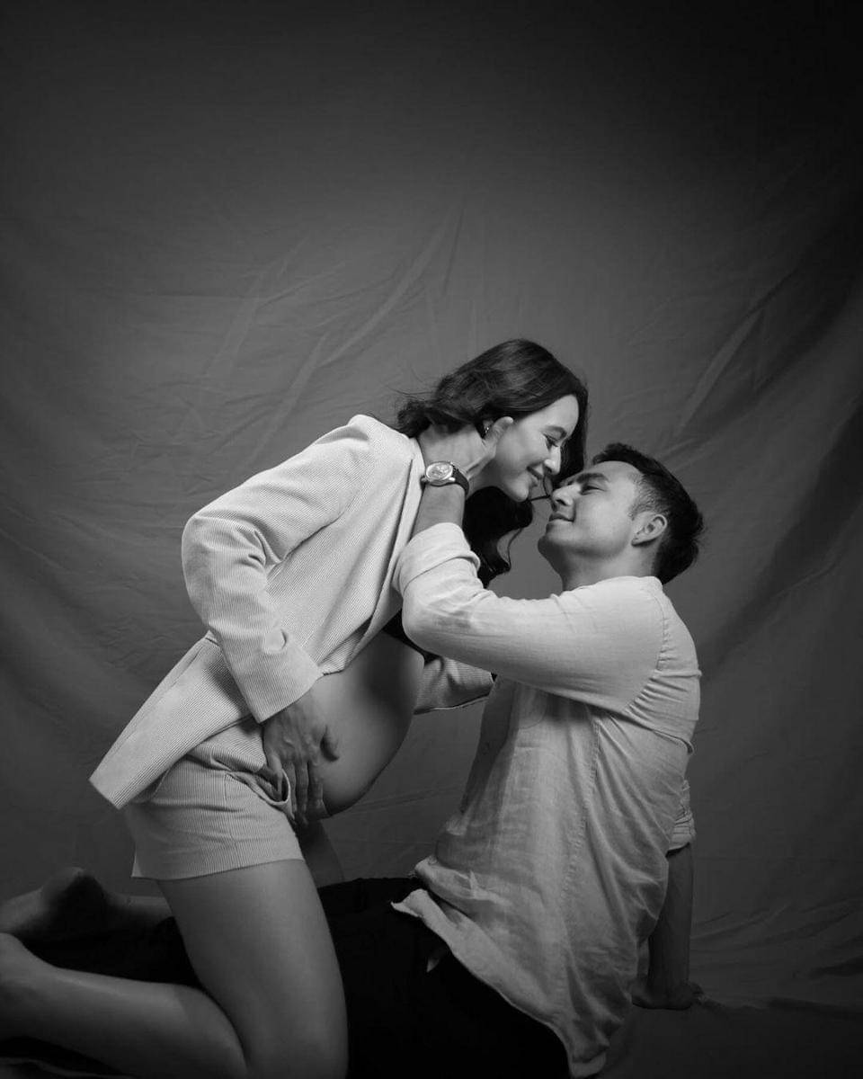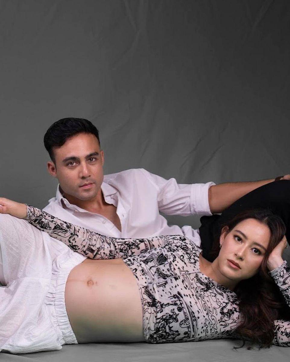 Sementara itu, Indra yang sedang berpose berlutut sambil memegang perut sang istri tampil dengan kemeja casual.