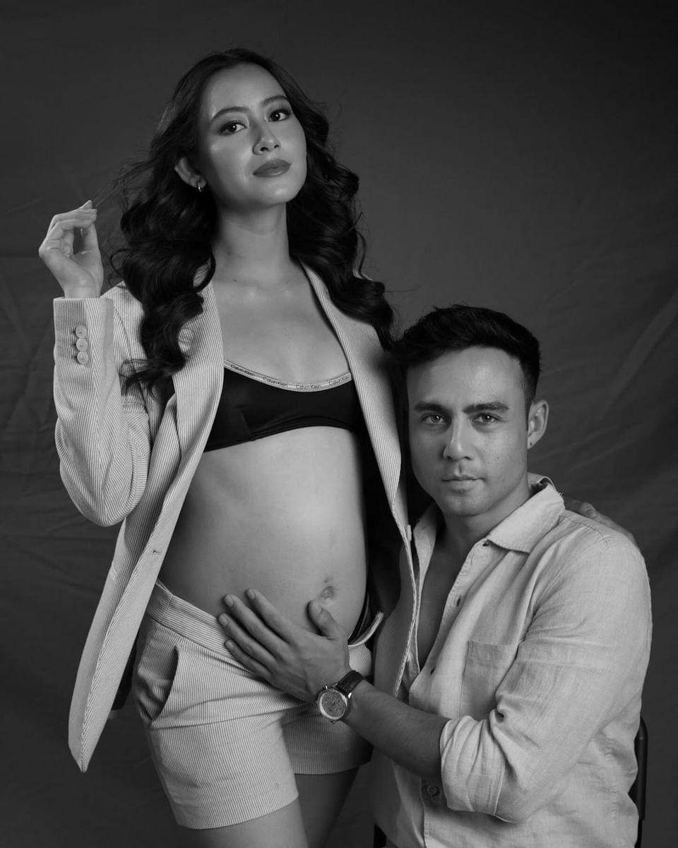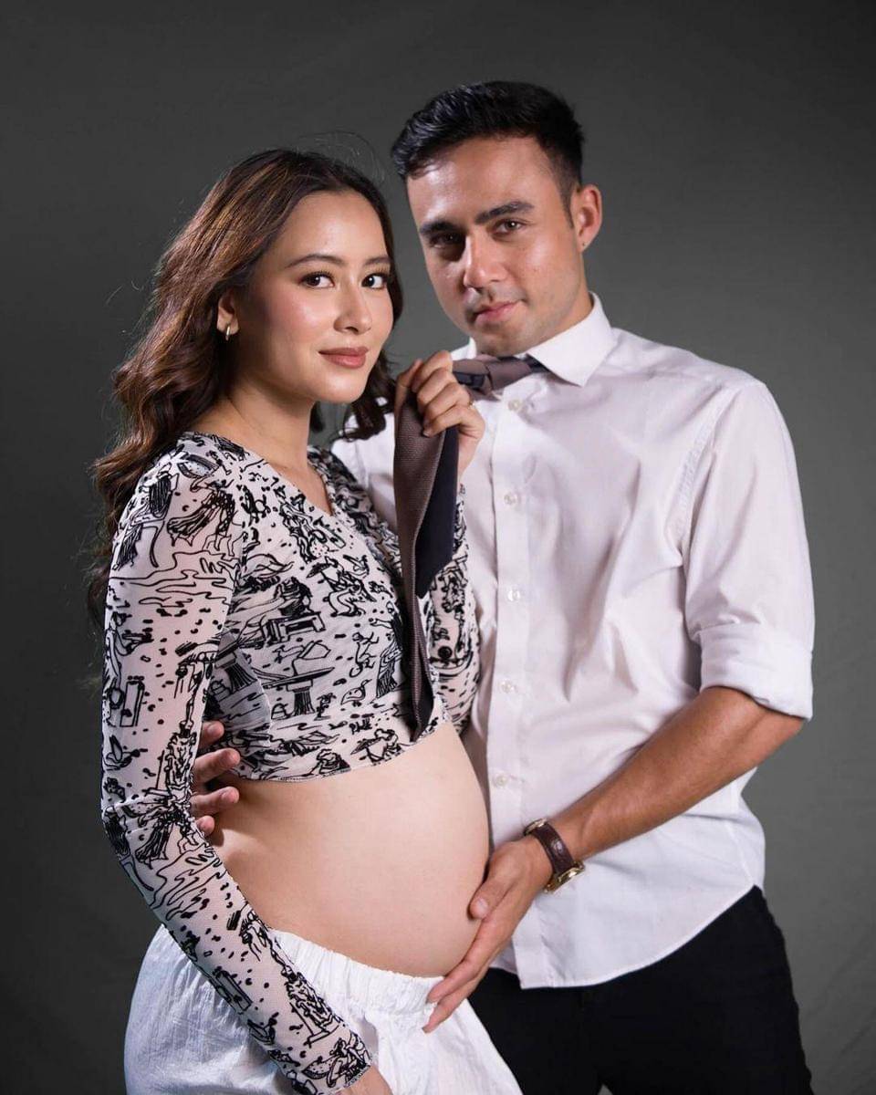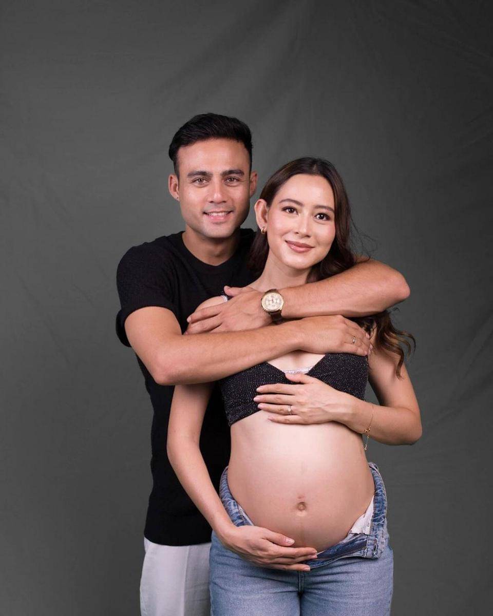 Sementara itu, Indra yang sedang berpose berlutut sambil memegang perut sang istri tampil dengan kemeja casual.