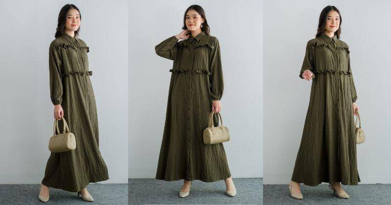 Untuk look bernuansa earth tone, Mama bisa mengenakan Shadi Maxi Dress dari Myrubylicious yang berwarna army. Dress ini terbuat dari bahan crinkle yang terasa lembut dan adem sehingga nyaman untuk ibu hamil.