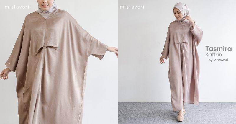 Salah satu kaftan bernuansa earth tone yang bisa Mama pertimbangkan adalah Tasmira Kaftan dari Mistyvori. Kaftan yang satu ini menggunakan bahan santorini silk yang memiliki tekstur crinkle dan warna mengkilap yang terlihat mewah.