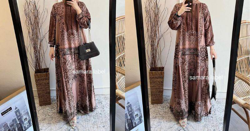 Dress ini juga memiliki potongan lebar sehingga bisa dikenakan ibu hamil. Selain itu, dress dari Samara Label ini juga dilengkapi ritsleting depan aktif untuk menyusui dan pergelangan tangan karet untuk memudahkan Mama saat berwudhu.