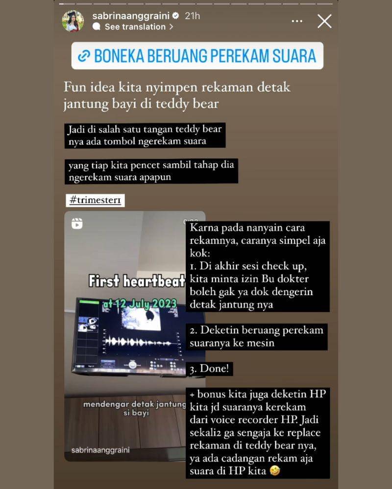 "Fun idea kita nyimpen rekaman detak jantung bayi di teddy bear," tulis Sabrina dalam unggahan Instagram Story-nya.